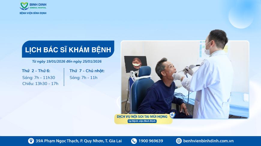 Để thuận tiện cho quá trình thăm khám, Bệnh viện Bình Định trân trọng gửi đến Quý người bệnh và khách hàng lịch khám của các bác sĩ trong tuần từ 19/01 đến 25/01/2026.