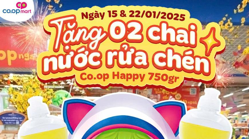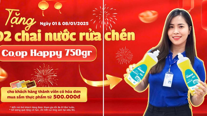 [Duy nhất 15/1 và 22/01/2026] ✨ Tặng ngay 02 chai nước rửa chén Co.op Happy 750gr cho hóa đơn mua Thực phẩm từ 500.000đ trở lên 🎁