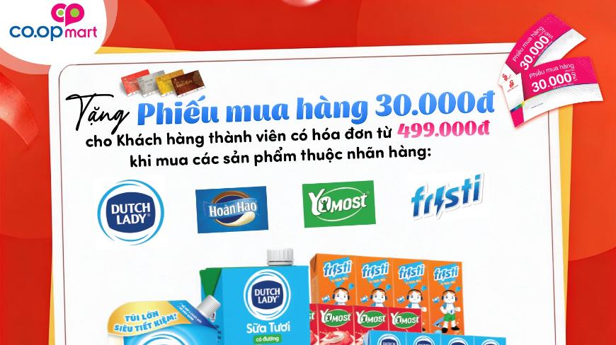 Từ ngày 29/01 đến 16/02/2026, Tặng Phiếu mua hàng 30.000đ cho Khách hàng thành viên có hóa đơn từ 499.000đ khi mua các sản phẩm thuộc nhãn hàng: Dutch Lady, Hoàn Hảo, Yomost, Fris...