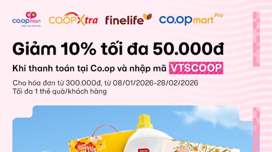 💥 Giảm 10% – Tối đa 50.000đ 👉 Cho hóa đơn từ 300.000đ khi thanh toán tại Co.opmart, Co.opXtra, Finelife, Co.opmart Pro