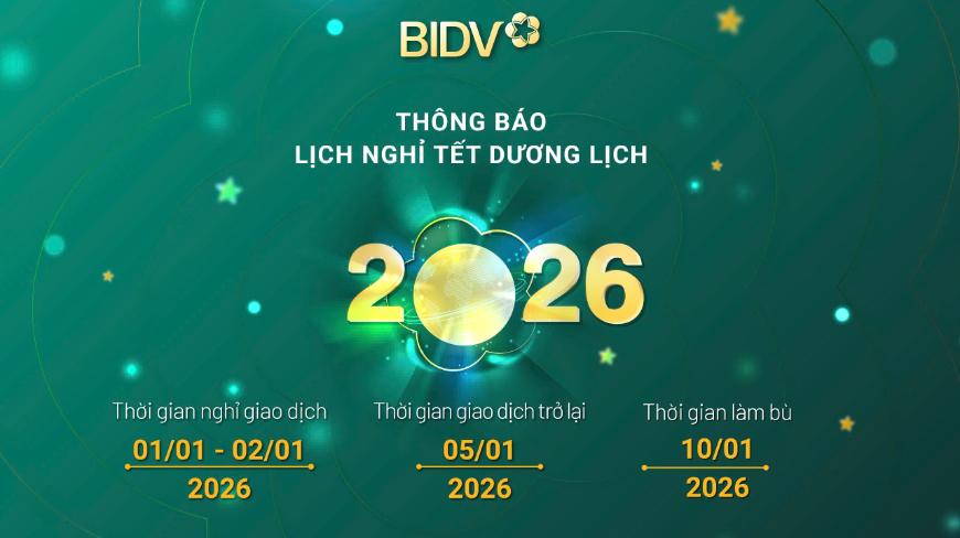 BIDV trân trọng thông báo đến Quý Khách hàng, Quý Đối tác về thời gian nghỉ Tết Dương lịch 2026 và thời gian làm bù như sau: