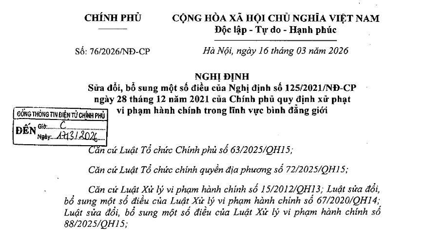 Nghị định số 76/2026/NĐ-CP đã điều chỉnh tăng mức phạt đối với các hành vi vi phạm hành chính trong lĩnh vực bình đẳng giới liên quan đến gia đình.