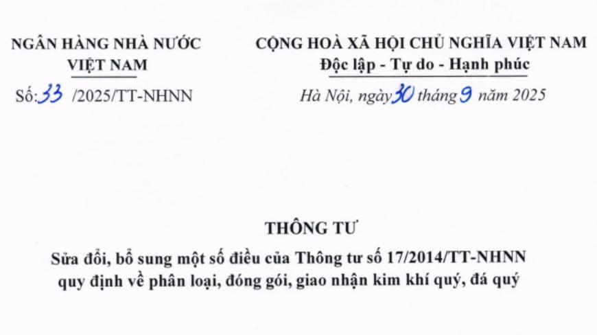 Ngân hàng Nhà nước Việt Nam ban hành Thông tư số 33/2025/TT-NHNN sửa đổi, bổ sung một số điều của Thông tư 17/2014/TT-NHNN quy định về phân loại, đóng gói, giao nhận kim khí quý, ...