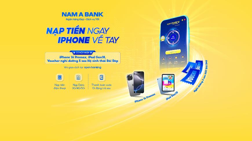 Nạp tiền dịch vụ dễ dàng tại Open Banking: 1 chạm nhận ngay Mã số dự thưởng quay số trúng iPhone 16Promax, iPad Gen10, Voucher nghỉ dưỡng 5 sao!