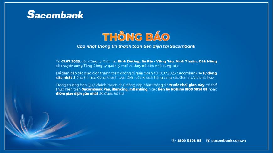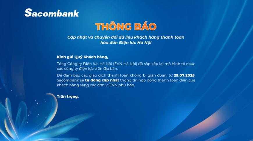 Thông báo Cập nhật thông tin thanh toán tiền điện tại Sacombank