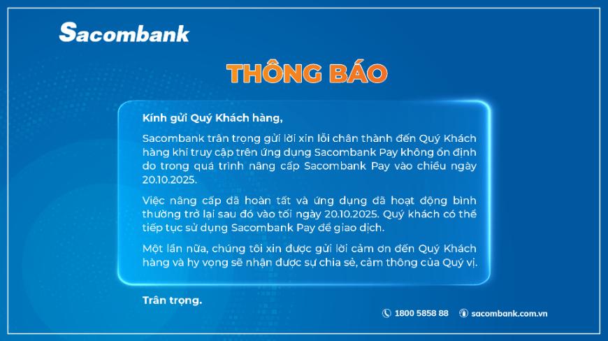 THÔNG BÁO 📲 ỨNG DỤNG SACOMBANK PAY ĐÃ HOÀN TẤT NÂNG CẤP & HOẠT ĐỘNG BÌNH THƯỜNG TỪ TỐI 20.10.2025