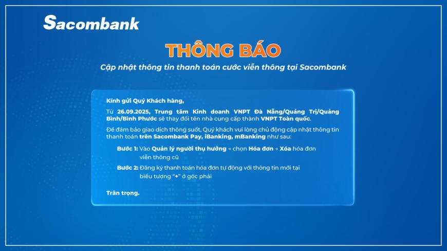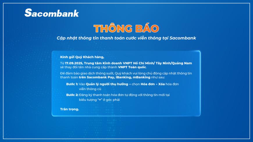 Thông báo Cập nhật thông tin thanh toán cước viễn thông tại Sacombank