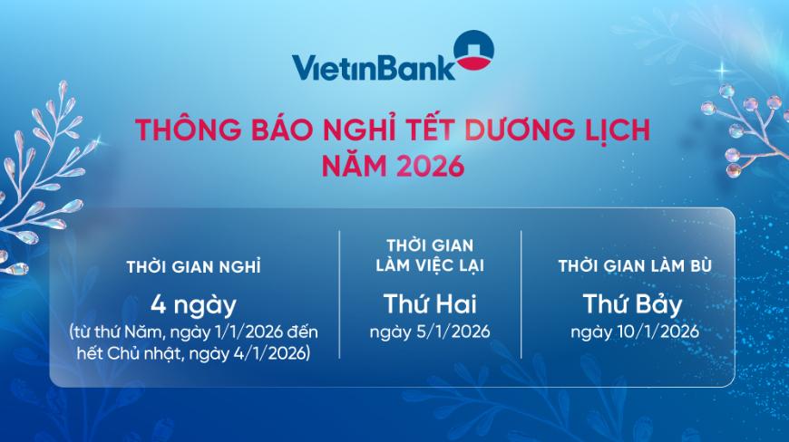 Kính gửi: Quý khách hàng! VietinBank thông báo lịch nghỉ Tết Dương lịch 2026. Trân trọng cảm ơn Quý khách hàng!