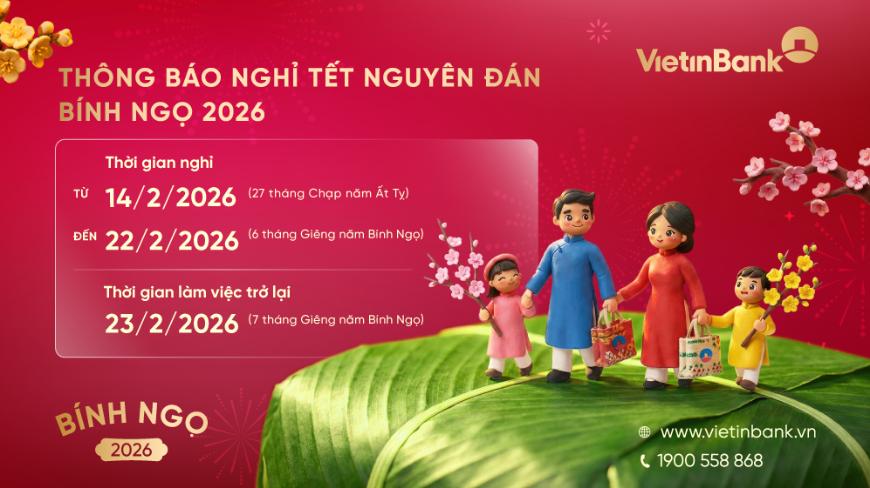 VietinBank thông báo lịch nghỉ Tết Nguyên đán Bính Ngọ 2026